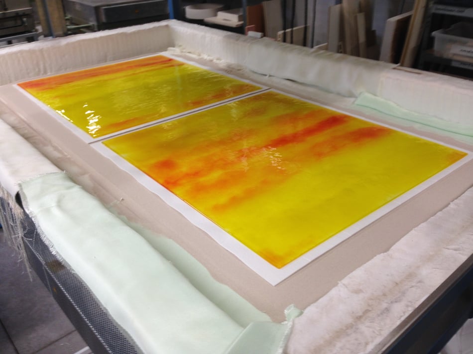 Twee panelen die onderdeel uitmaken van een glazen "gordijn" van 32 m2 in een kerk in Zwolle.